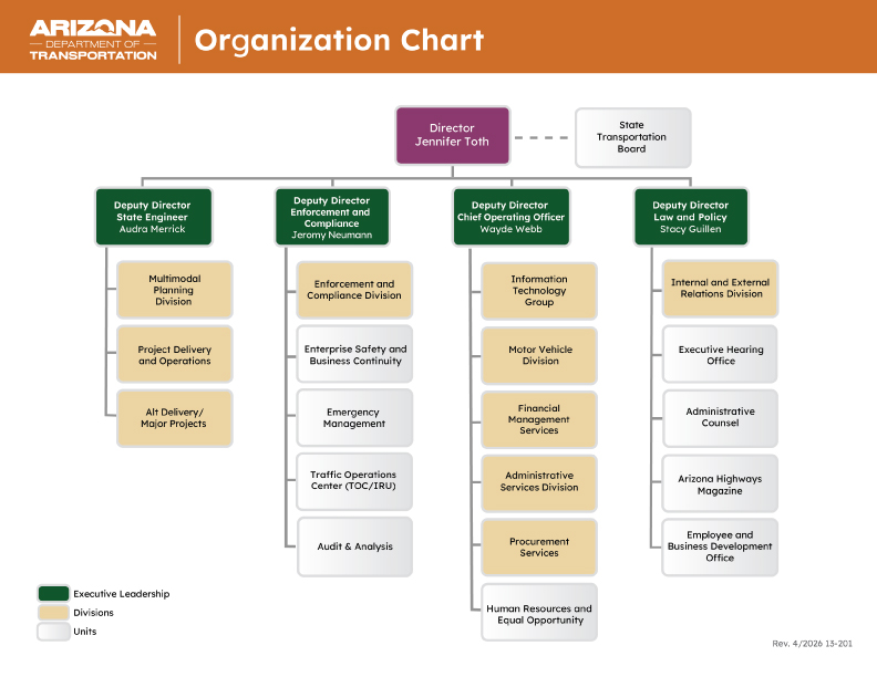 Home About Us Organization Chart Organization Chart Organization Chart The chart below reflects the organization of the Arizona Department of Transportation as of January 2026. View the PDF version Main navigation Annual Report Audit and Analysis Boards and Committees Executive Leadership Financial Management Services Government Relations Inside ADOT Organization Chart Transportation Safety