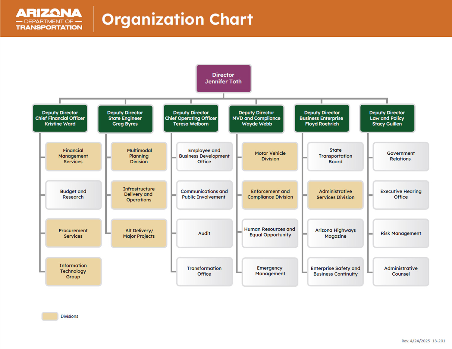 Home About Us Organization Chart Organization Chart Organization Chart The chart below reflects the organization of the Arizona Department of Transportation as of July 2025. View the PDF version Main navigation Annual Report Audit and Analysis Boards and Committees Executive Leadership Financial Management Services Government Relations Inside ADOT Organization Chart Transportation Safety