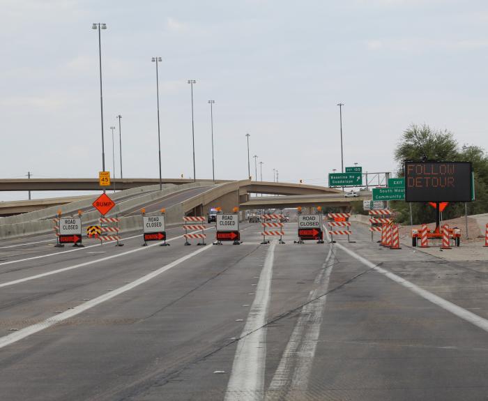 On a complex project in a large metropolitan area, it may be a natural inclination during freeway closures for some drivers to self-detour onto local roads. ADOT collaborates with local cities and towns in the project area on a unique program to make sure drivers can get where they’re going without too much delay and with minimal disruption.