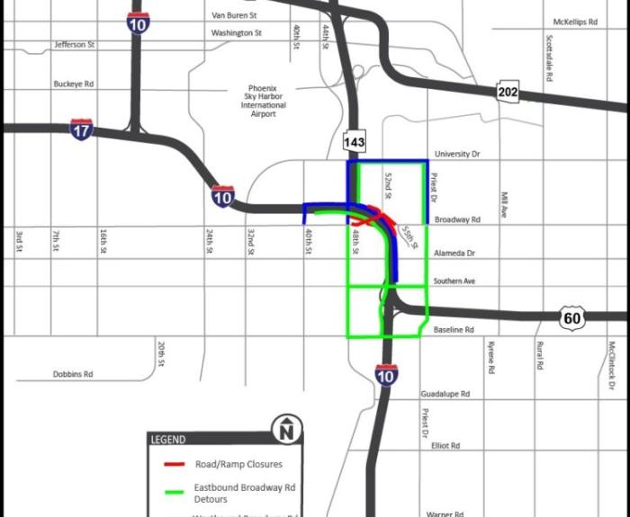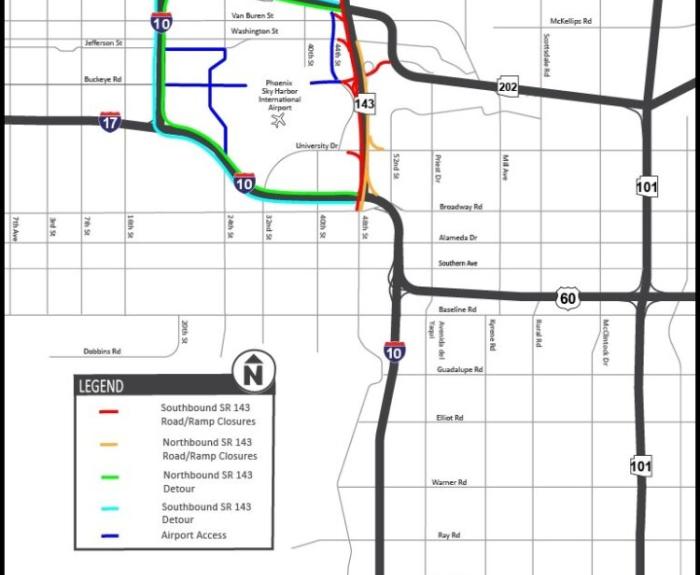 PHOENIX –The Arizona Department of Transportation advises motorists with plans to use State Route 143 this weekend to allow extra time and be ready to use detours while crews with the I-10 Broadway...