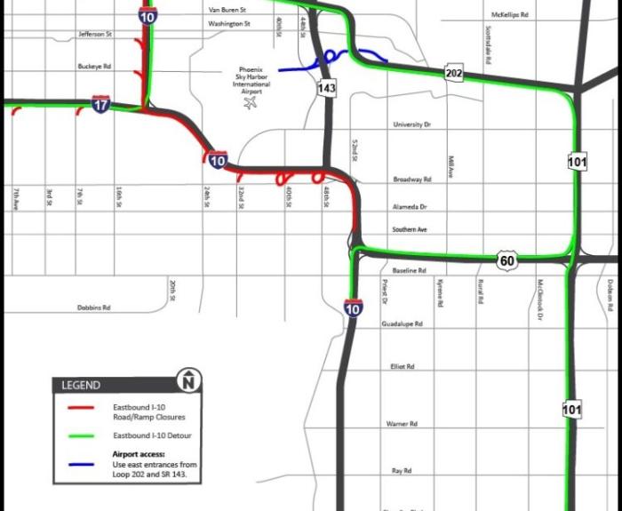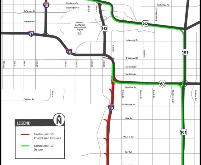 PHOENIX –The Arizona Department of Transportation advises motorists to allow extra travel time and plan to use detours if they are traveling on Interstate 10 in the East Valley and near Phoenix Sky...