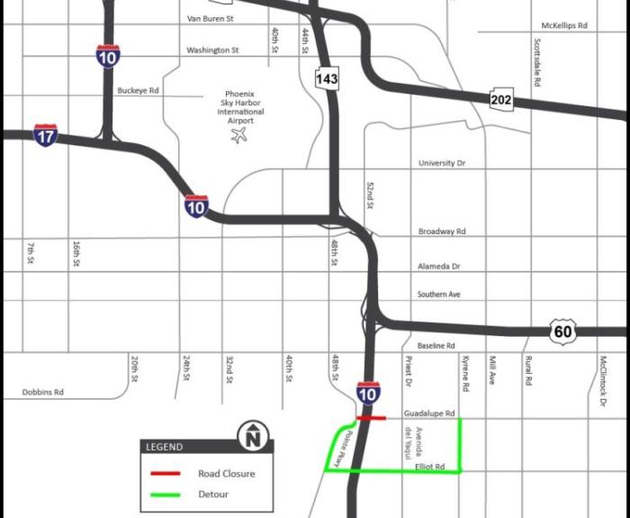 PHOENIX – As part of the I-10 Broadway Curve Improvement Project, Guadalupe Road will be closed in both directions between Pointe Parkway and Calle Sahuaro from 4 a.m. Monday, July 11, through 8 p.m...
