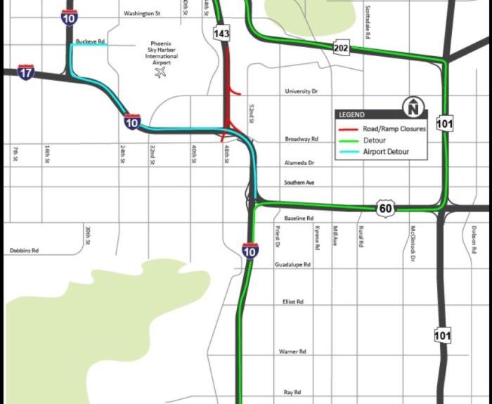 Northbound State Route 143 between Interstate 10 and Washington Street to close this weekend (March 19-21) Crews setting up work zones for bridge construction in conjunction with the I-10 Broadway...