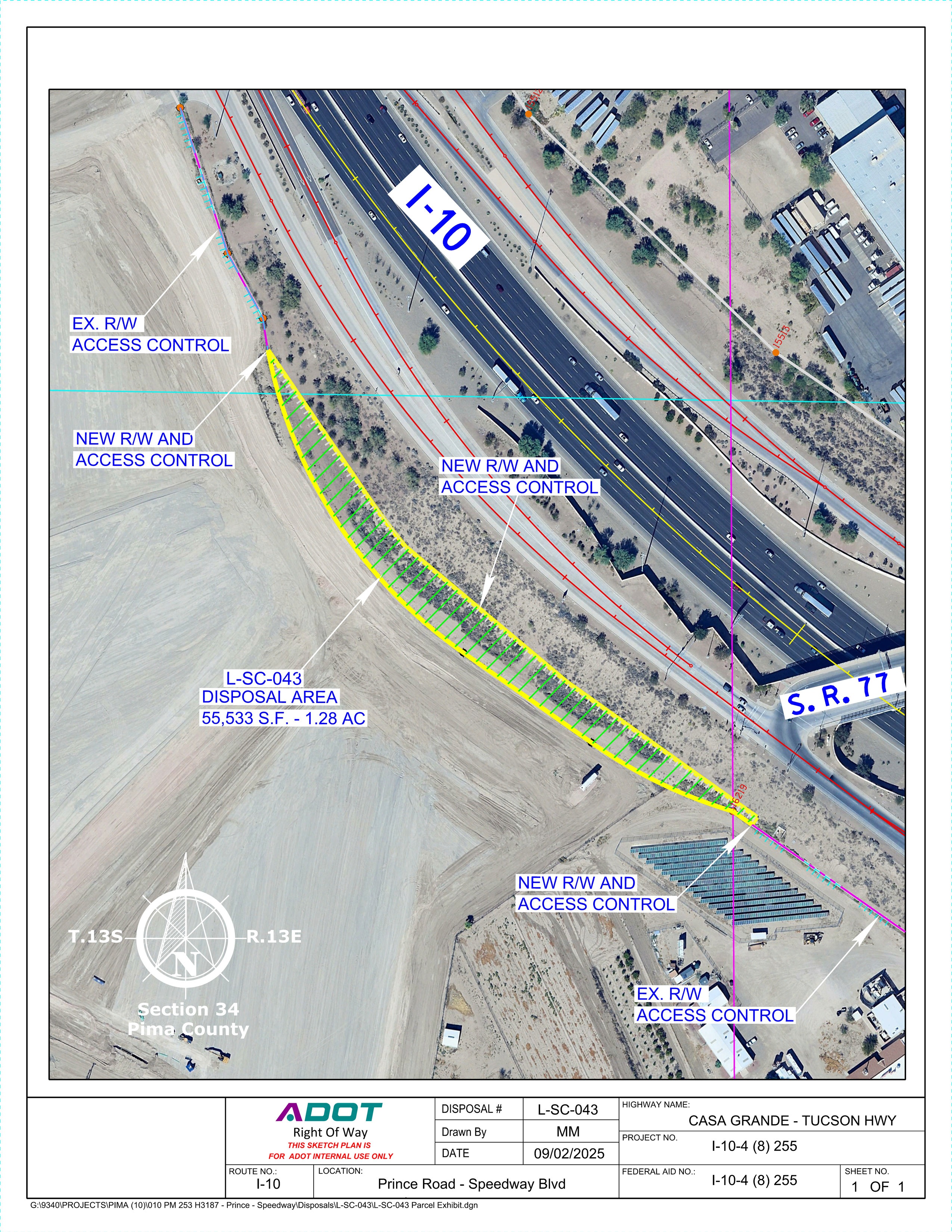 ±67,725 sq. ft. / ±.1.554 acres PRICE REDUCED OFFER TENDERED ADOT will accept additional offers on or before Monday, November 10, 2025, at 2:00 PM, Arizona time, for no less than the minimum bid. Offers must be submitted to: ADOT 205 S. 17th Ave., Mail Drop 612E, Phoenix, AZ 85007-3212. If any additional offers are submitted, the property will be sold at a Public Auction on Thursday, November 13, 2025, at 9:30 AM, Arizona time, by teleconference and in person. Bid Increments: $2,000. For additional details and instructions, please contact ROW Agent Annette Valverde @ [email protected] or phone at 602.712.7186. |