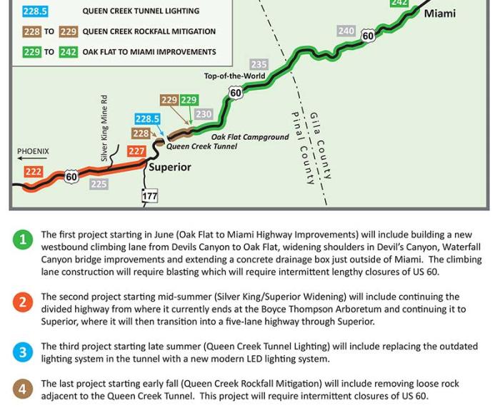 … US 60 Corridor Improvement Projects Attention motorists who travel regularly on US 60 between … 60 will start in June, when ADOT will build a new westbound climbing lane and widen … system. This will be the first tunnel in Arizona to have this LED technology. The new …