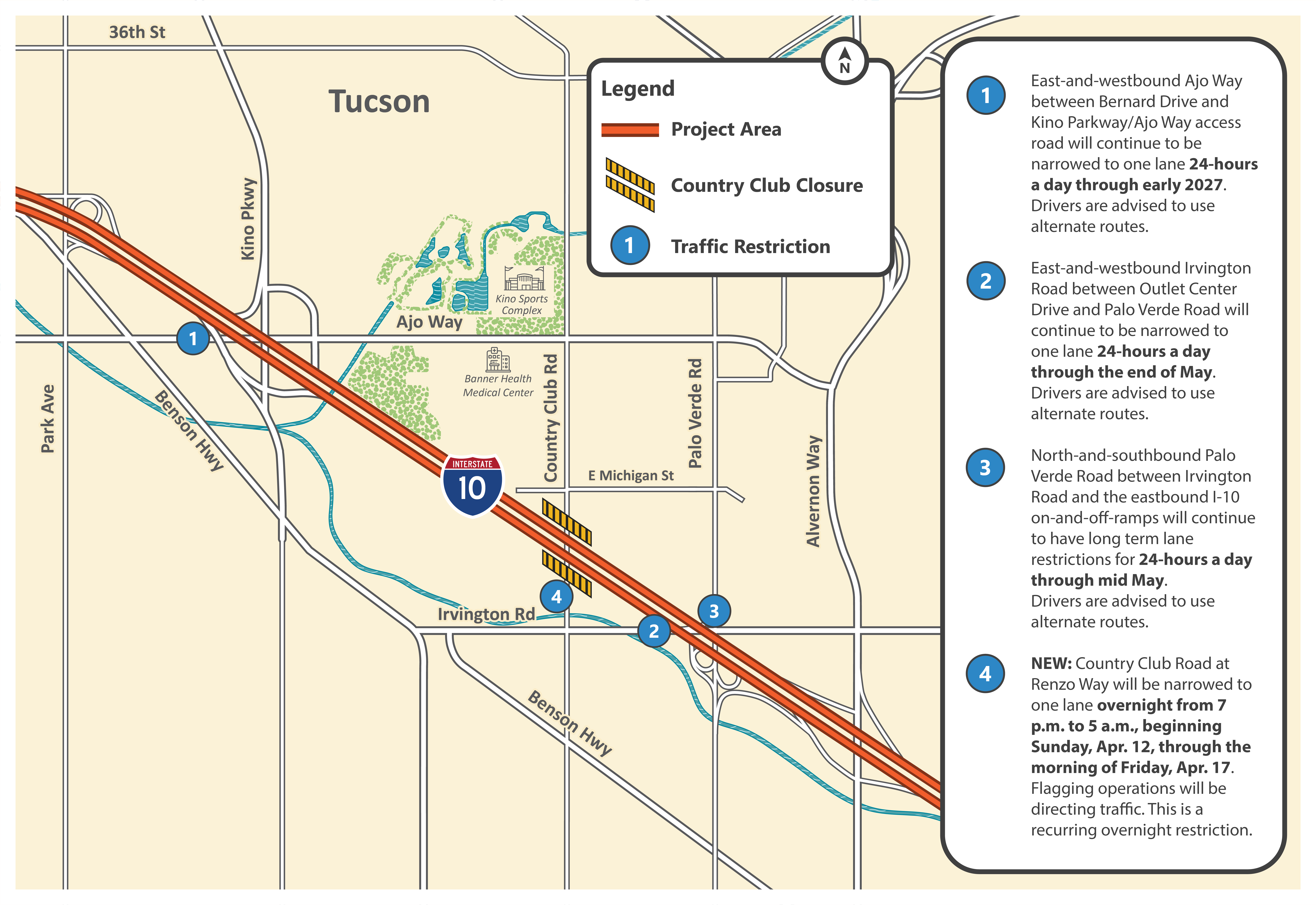 - East-and-westbound Ajo Way between Bernard Drive and Kino Parkway/Ajo Way access road will be narrowed to one lane 24-hours a day through April. Drivers are advised to use alternate routes.