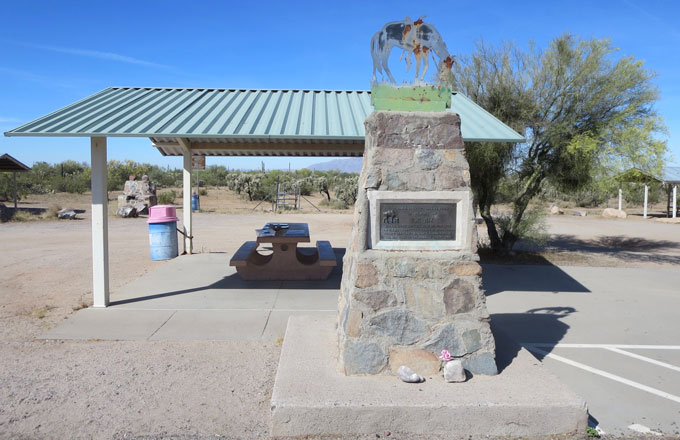 The Arizona Department of Transportation rest stop along the 42-mile Pinal Pioneer Parkway includes ramadas, picnic tables, an informal display and a marker that reads: