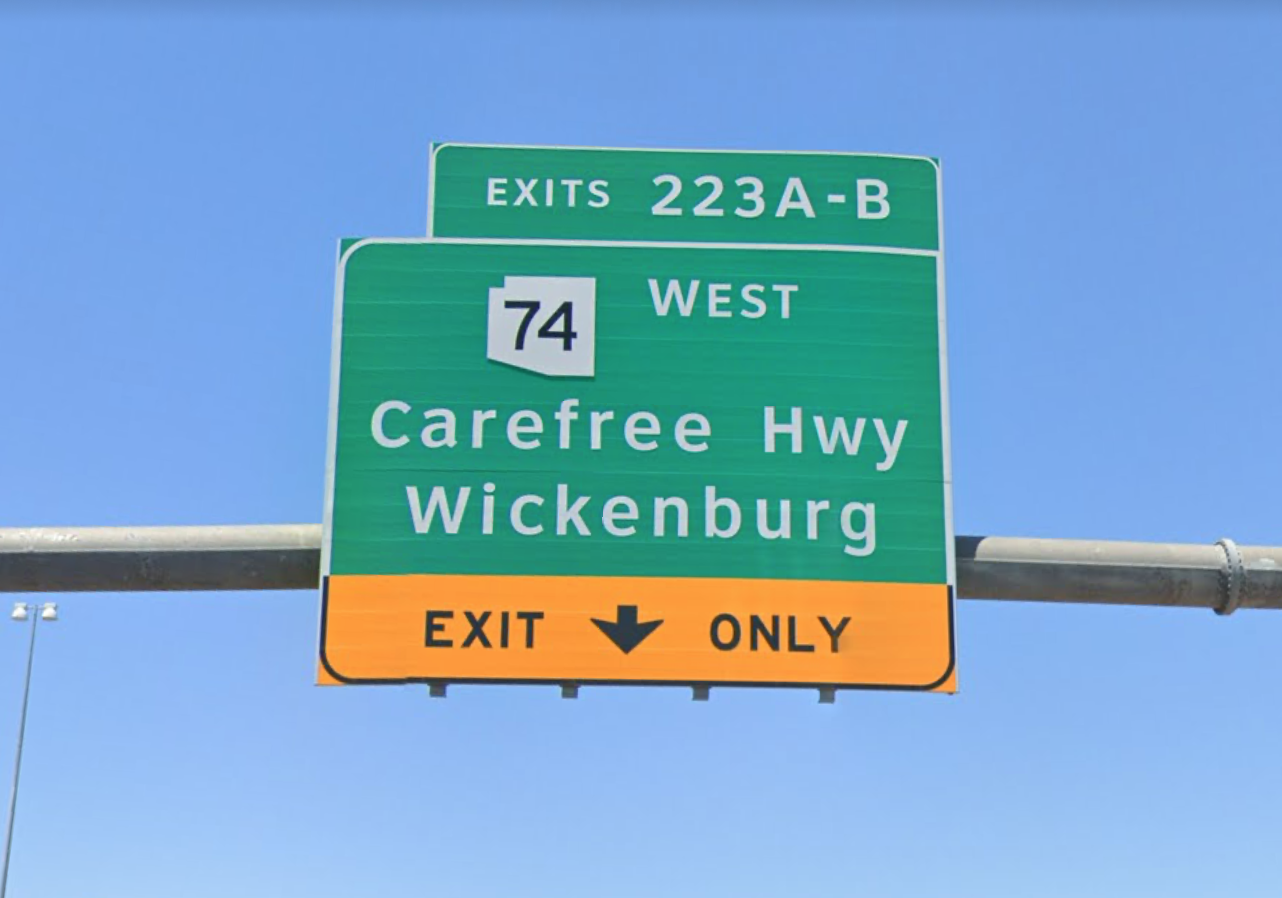 But Phoenix-area drivers know that Carefree Highway is not just a catchy song title. It's the formal name of a road running east of I-17 and the state highway system in the north Valley, and it's a nickname for one section of State Route 74, giving ADOT leeway to bask in some of the song's glory. SR 74 was commissioned in 1964 and stretches 30 miles between US 60 just south of Wickenburg to Interstate 17 in north Phoenix. It actually goes by three different names along the way: Morristown-New River Highway, Lake Pleasant Highway, and finally Carefree Highway. The "Carefree Highway" that has the name extends east from I-17 all the way to Scottsdale Road, but it's no longer part of SR 74.