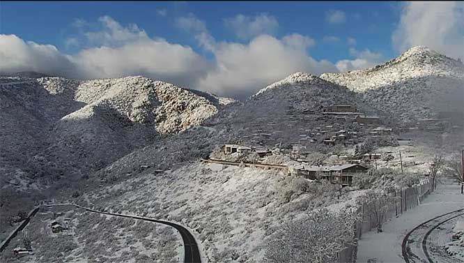 Another favorite webcam is operated by KZRJ-FM, in Jerome. The station’s HD camera scans across historic homes and buildings on Cleopatra Hill, shows vehicles traveling along State Route 89A and swings around to show the Verde Valley and even the distant San Francisco Peaks. Jerome is always photogenic, but the town is in its Sunday best in snowstorms or fog.