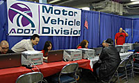 To make sure they could process people on site, MVD employees brought 12 complete work stations to the Coliseum. Those work stations were set up just like an actual MVD office. Veterans were able to conduct transactions for driver license applications, renewals, written examinations and the road skills test (Courtesy Chevrolet provided three vehicles to be used for those who did not have one of their own).